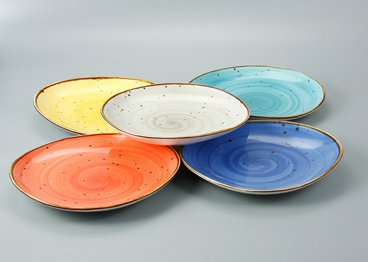三角形の設計のこの8.25インチの陶磁器のディナー用大皿は黄色い色の最も敏感な調子とずっと茶色のまさに小さい点のスプレーと手塗りである。さらにそれらは無作法な縁の活気に満ちたライトによってさらにもっと特別になされる。形および色の組合せは顕著である。